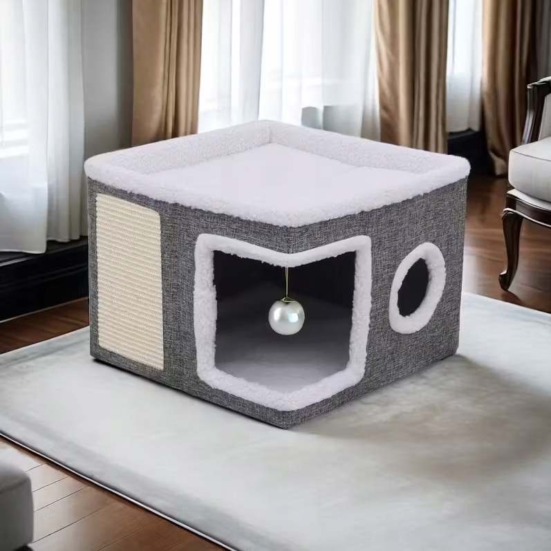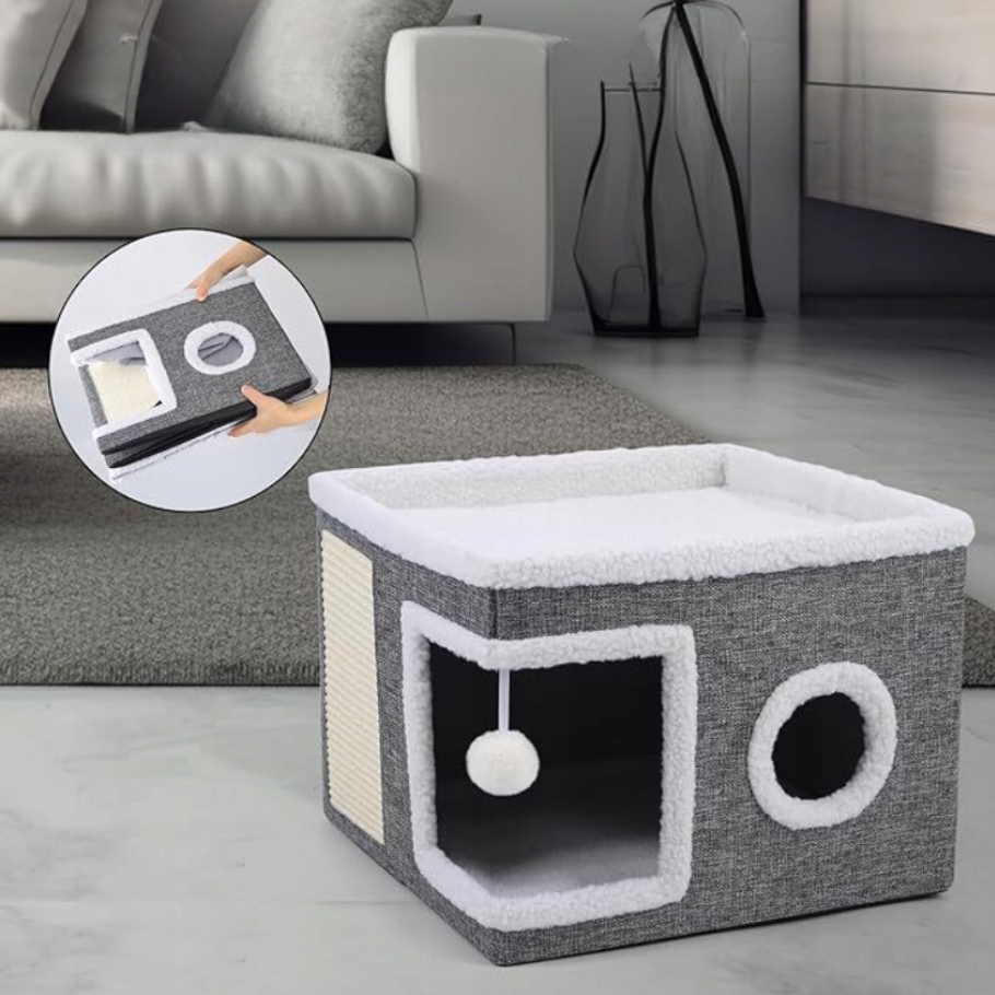 Składany dwupoziomowy domek dla kota – szary z pluszem 41 × 41 × 32 cm