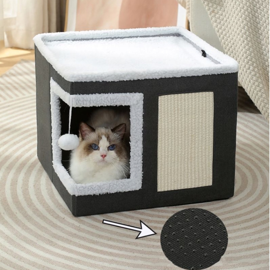 Dolna część domku to zamknięta, osłonięta przestrzeń, która zapewnia kotu spokójciepło poczucie bezpieczeństwa — idealna na drzemki i odpoczynek. Górny poziom stanowi miękka, pluszowa platforma, doskonała do wygodnego leżeniarelaksu oraz obserwowania otoczenia z ulubionego punktu widzenia. 🐾