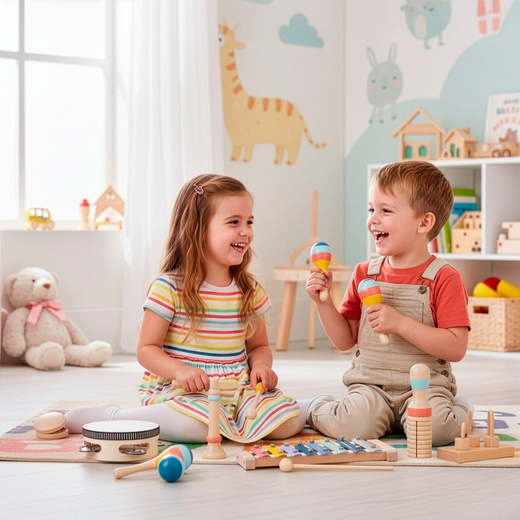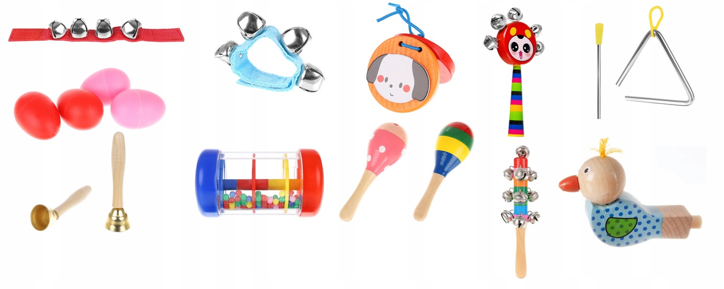 Instrumenty perkusyjne takie jak marakasy i janczary rozwijają zmysł słuchu, rytmikę i sprawiają wiele radości. Dzięki różnym fakturom i kształtom wspierają także rozwój sensoryczny.