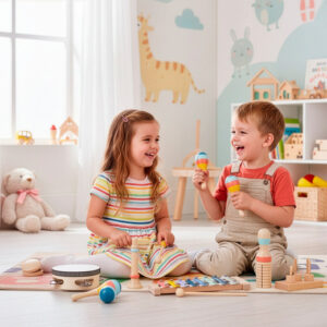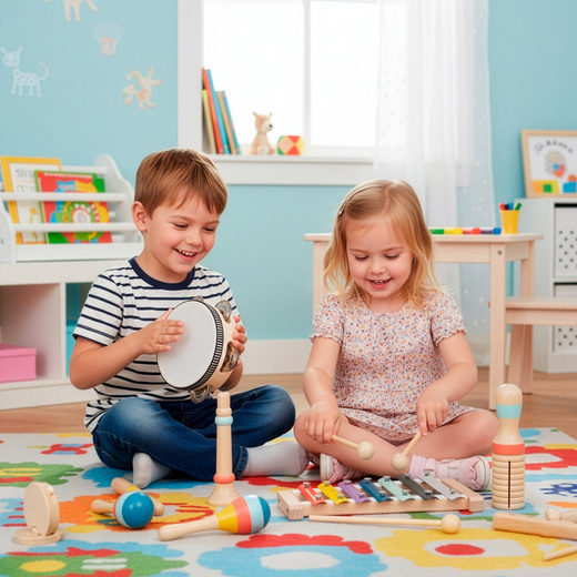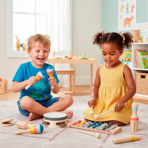 Zabawa instrumentami wspomaga rozwój koordynacji ruchowej, koncentracji, słuchu, poczucia rytmu oraz umiejętności współpracy z innymi dziećmi.