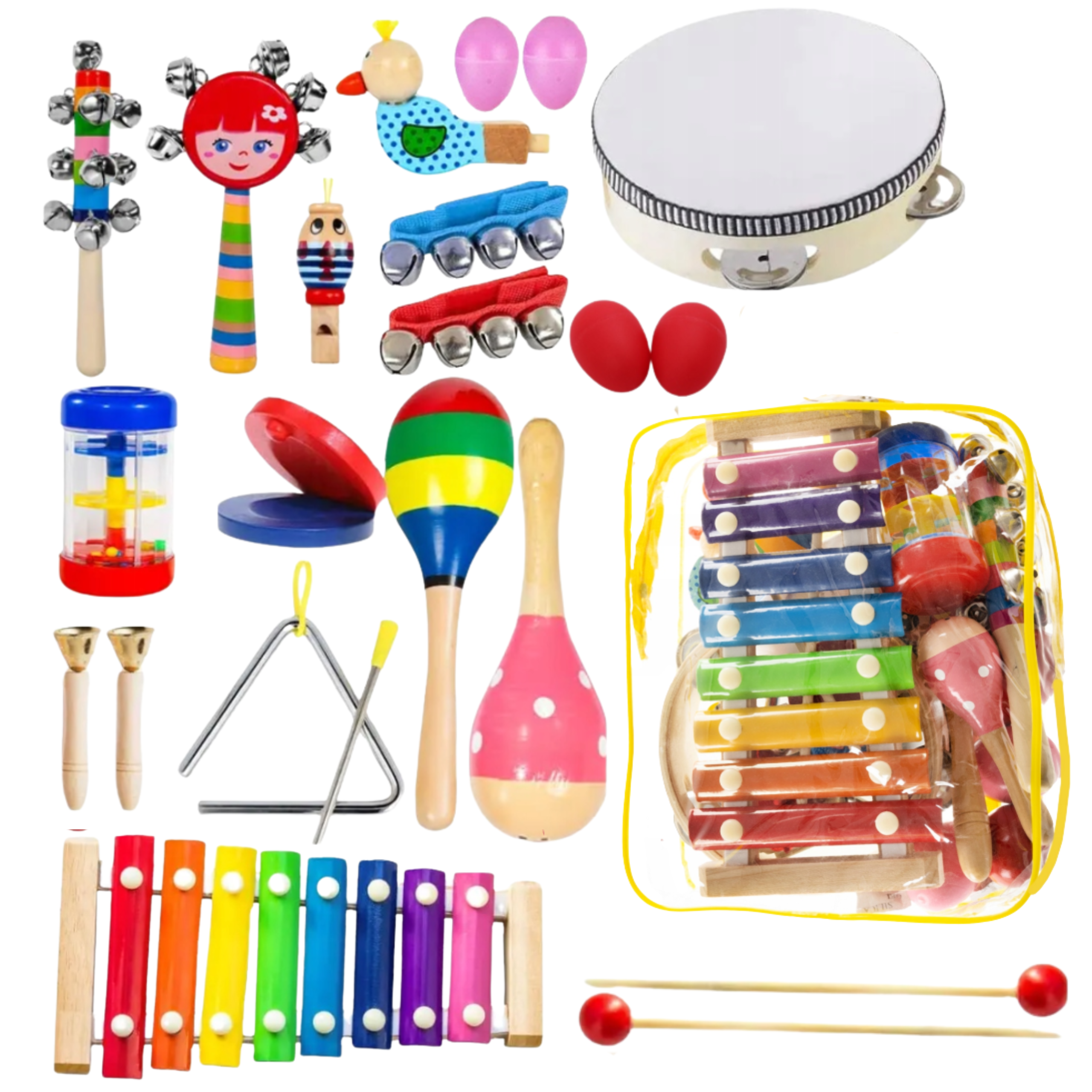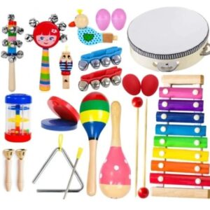 W skład zestawu wchodzi aż 18 różnorodnych instrumentów, które umożliwiają dziecku tworzenie pierwszych dźwięków, naukę rytmu, rozpoznawanie brzmień i rozwijanie wyobraźni muzycznej.