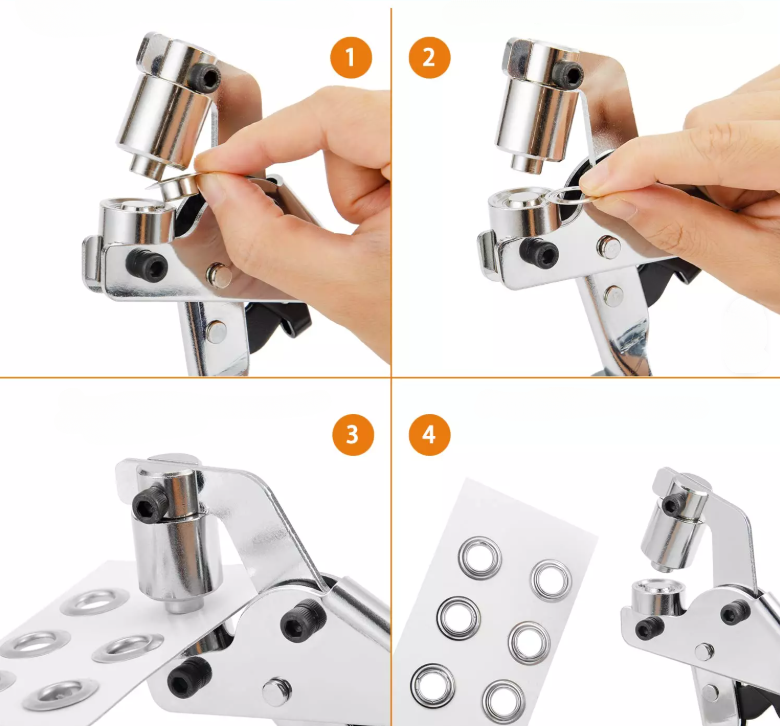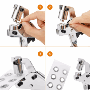 - Włóż materiał pomiędzy obie formy – upewnij się, że otwór oczka znajduje się dokładnie w wybranym miejscu.