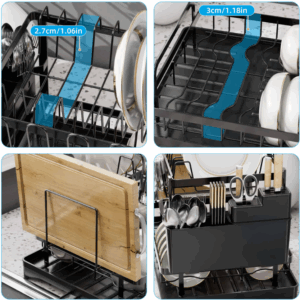 ✅ Praktyczne dodatki – w zestawie ociekacz na sztućce, uchwyt na deskę do krojenia oraz regulowany odpływ wody, zwiększające funkcjonalność suszarki.
