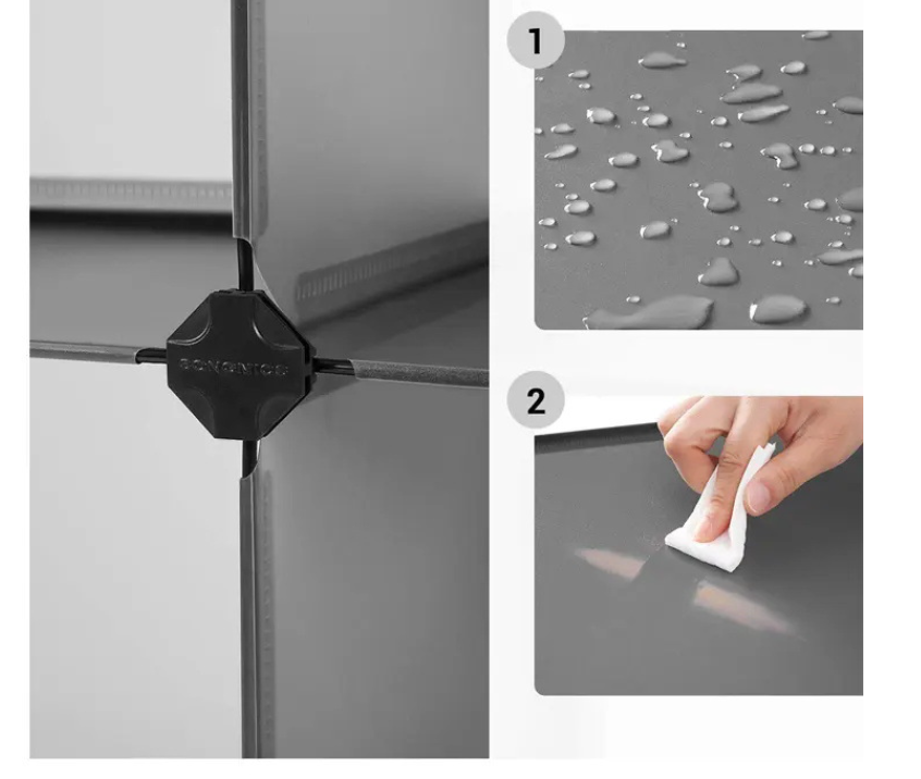 Przód pudełka wykonany jest z półprzezroczystego tworzywa sztucznego, co pozwala łatwo zobaczyć zawartość bez konieczności otwierania. Dzięki szufladce otwieranie pudełka jest niezwykle proste. Konstrukcja szafki opiera się na polipropylenowych płytach wzmocnionych metalowym stelażem oraz elementach łączących wykonanych z ABS. Ściany szafki łączy się za pomocą dołączonych narożników.