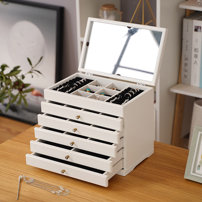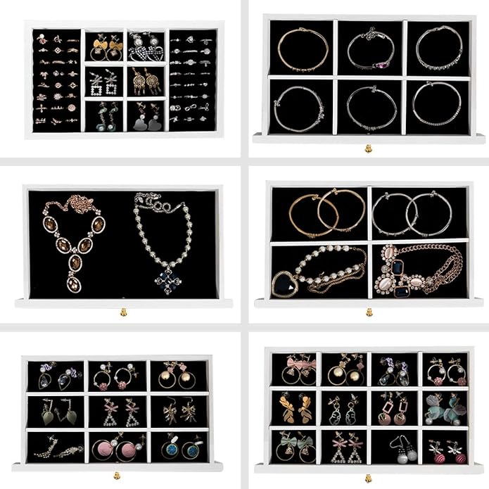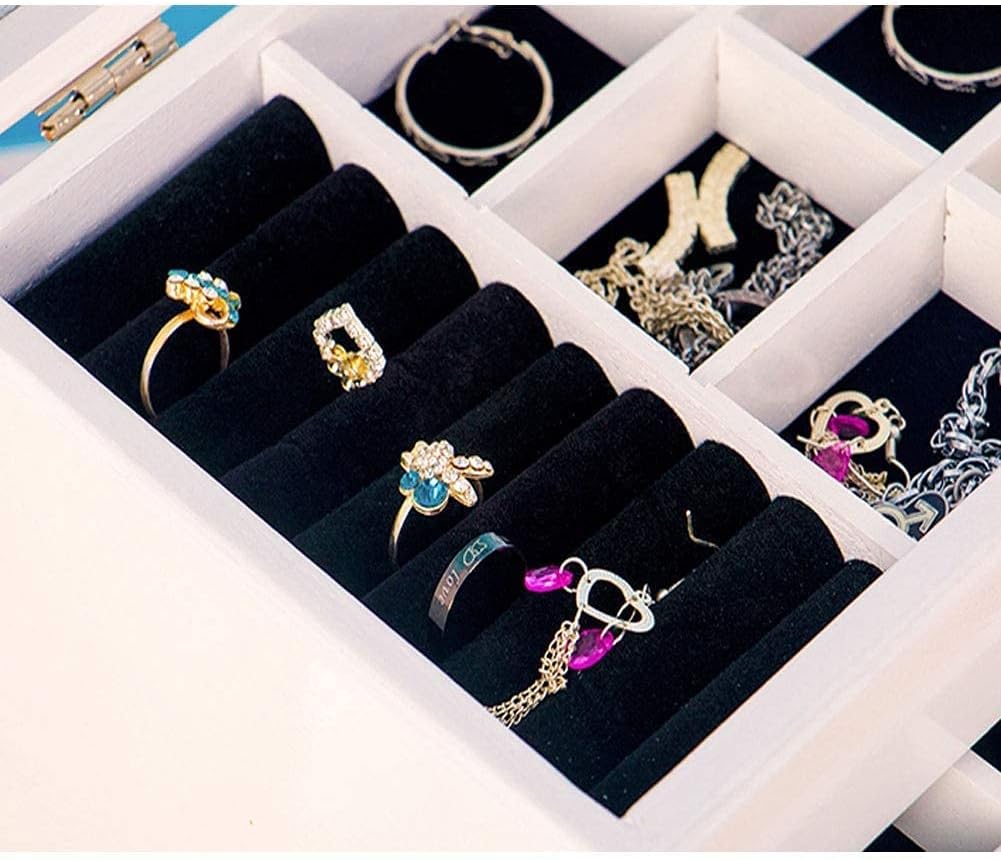 Szuflady i przegródki wyłożone są miękkim aksamitem, który chroni biżuterię przed zarysowaniami i uszkodzeniami, zapewniając bezpieczne przechowywanie.