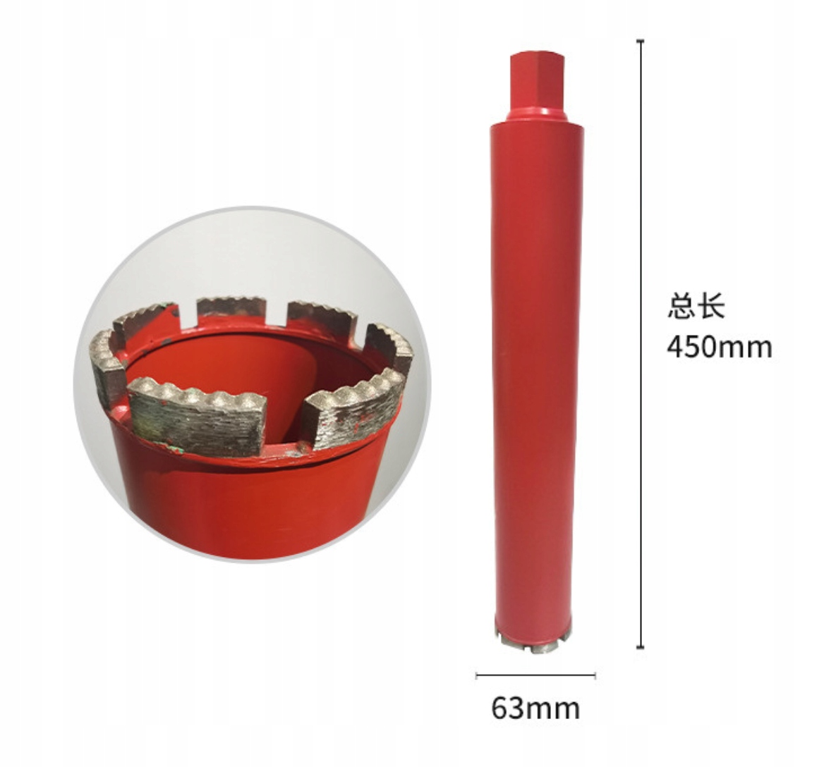 ✅ Profesjonalne wiertło koronowe diamentowe o wymiarach 63 mm średnicy i 450 mm długości przeznaczone do wiercenia w twardych materiałach budowlanych, takich jak: