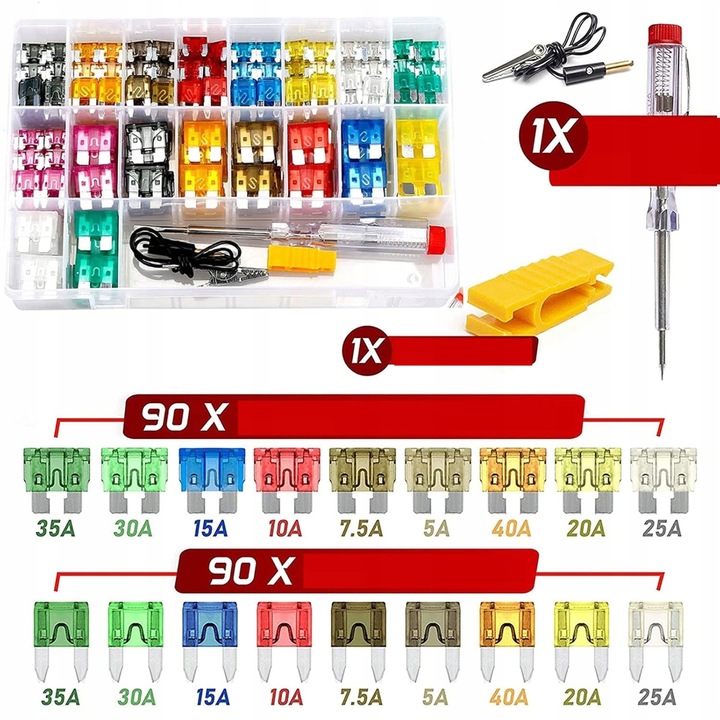 ➡️ Typy bezpieczników: standardowe (90szt.) i mini (90 szt)