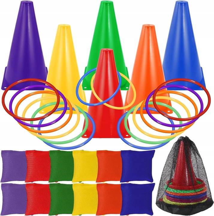 10 OBRĘCZY – dodatkowo, zestaw zawiera 10 kolorowych obręczy. Są one lekkie i idealne do celowania oraz wprowadzania nowych taktyk do gry. Można je umieścić na pachołkach lub wokół woreczków, aby stworzyć różnorodne cele i punkty do zdobycia.